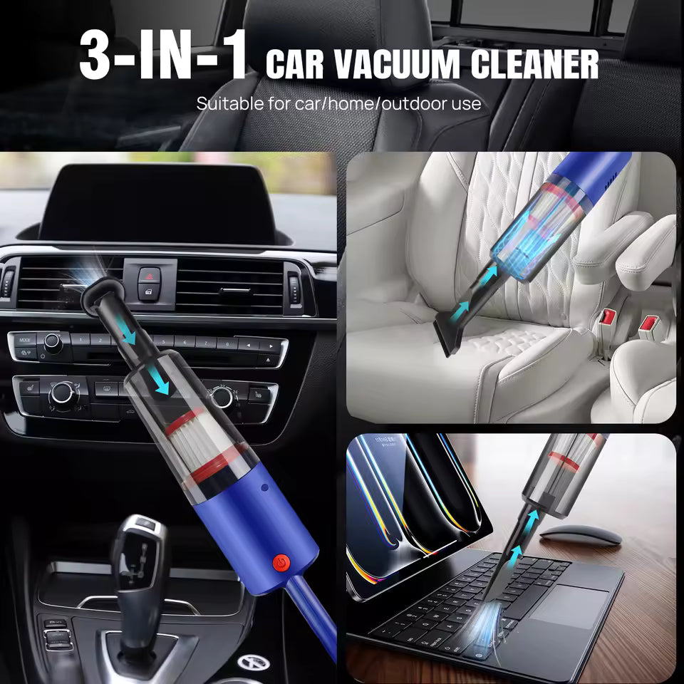 The 3-in-1 Car Vacuum Cleaner is a versatile tool designed to make car cleaning effortless and efficient. With powerful suction, it easily removes dust, crumbs, pet hair, and debris from carpets, seats, and floor mats. Its multi-function design allows for dry vacuuming, wet cleaning, and even air blowing to reach tight corners and vents. Lightweight, cordless, and ergonomically designed, it ensures comfortable handling while providing complete access to every part of your vehicle.